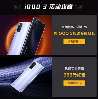 在2月25日~2月28日期间,预付iQOO 3定金有机会抽取清空购物车特权(购物车内最贵的一件商品),付尾款则有机会抽取iQOO全系列手机大礼包(限量5份等你赢取),并且享受优先发货特权。