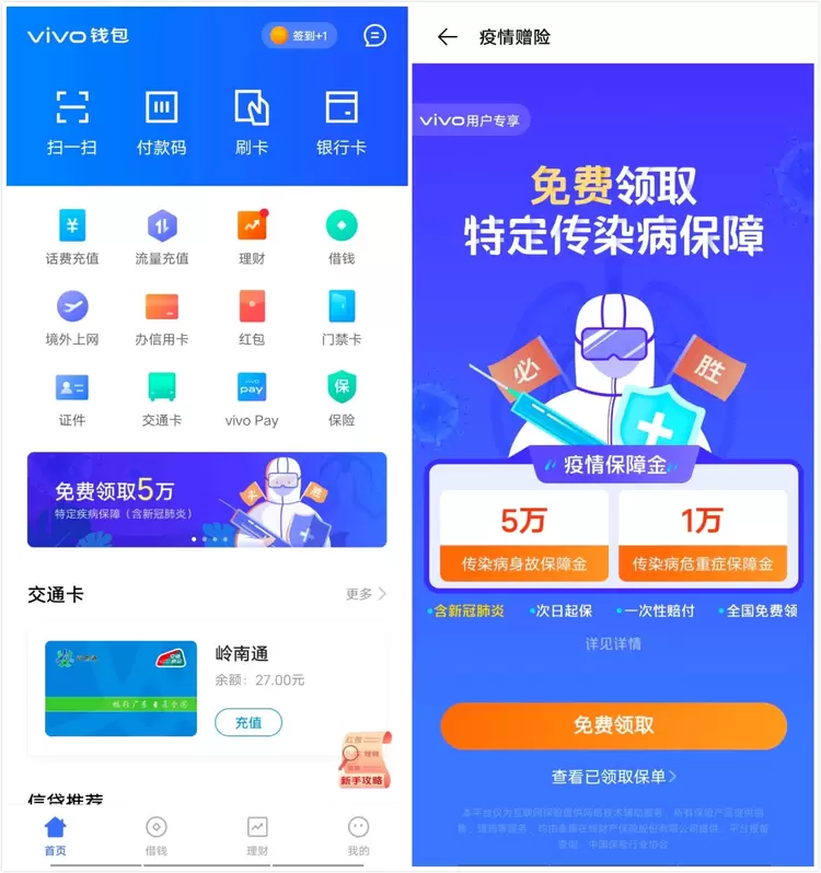 在疫情特殊时期,vivo始终与用户在一起。继前段时间推出无接触购机服务、室内运动免费课程、延长保修政策、以及上线“密切接触者测量仪”快应用等一系列举措后,近期vivo又为用户提供了“疫情保障金”风险保障服务。只要是vivo手机用户,即可免费领取最高5万元的防疫保险。