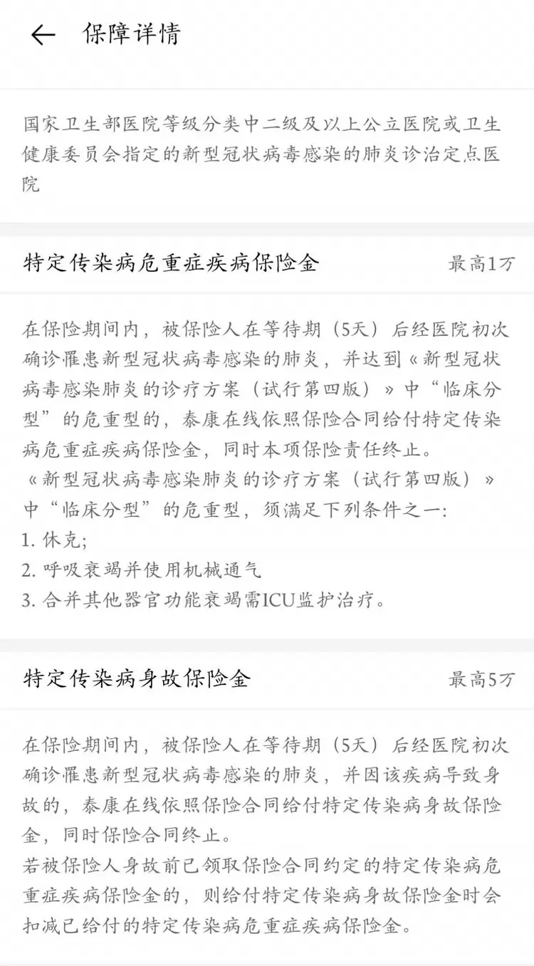 需要注意的是,本次保障金仅限中国境内(不含港澳台地区)的vivo用户领取,投保年龄为18-65周岁。当完成以上操作投保成功后,次日零时开始生效,保障期限为1个月。在保险期间内,被保险人经确诊罹患新型冠状病毒感染的肺炎,可获最高1万元的特定传染病危重症疾病保险金;若在保险期间内,被保险人经确诊罹患新型冠状病毒感染的肺炎,并因该疾病导致身故的,可获最高5万元的特定传染病身故保险金。具体保障条款可参考“保障详情”。