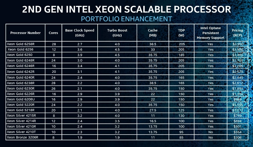 全新第二代英特尔至强可扩展处理器SKU堆栈