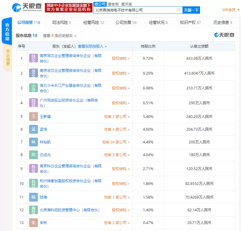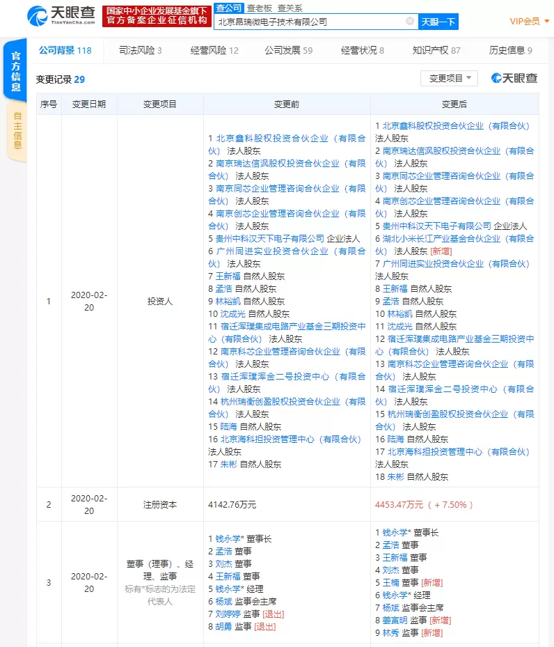 据天眼查数据显示,2月20日,昂瑞微电子的运营主体——北京昂瑞微电子技术有限公司发生工商变更,新增法人股东湖北小米长江产业基金合伙企业(有限合伙),持股比例为6.98%,位列公司第三大股东。与此同时,公司注册资本也由原来的约4143万人民币新增至约4453万人民币,增幅为7.50%。此外,刘婷婷和胡勇卸任公司监事,新增董事王楠,新增监事姜寅明和林秀。