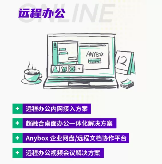 在线战“疫”计划五大行动包括:行动一:赠送1千万元公有云资源,支持在线医疗、在线教育、远程办公等在线服务商;行动二:免费提供云桌面授权,再赠送最高10 万元上云大礼包,帮助企业一步开启云上办公;行动三:免费开放远程内容协作平台Anybox,保障企业员工提升远程办公效率;行动四:通过SD-WAN分钟级接入企业内网办公环境,并提供为期2个月价值5万元的免费服务,帮助企业员工远程办公;行动五:向每家《来自SaaS行业的一封公开信》联署的 SaaS 企业提供总额 10 万元云资源,另以营销、销售与售后能力为SaaS企业加持。