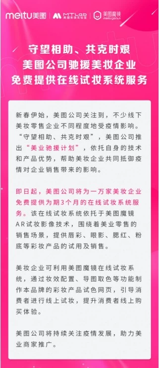 2月25日,美图公司宣布推出“美业驰援”计划,免费为一万家美妆企业提供为期3个月的在线试妆系统,与受疫情影响的线下美妆零售业共渡难关。