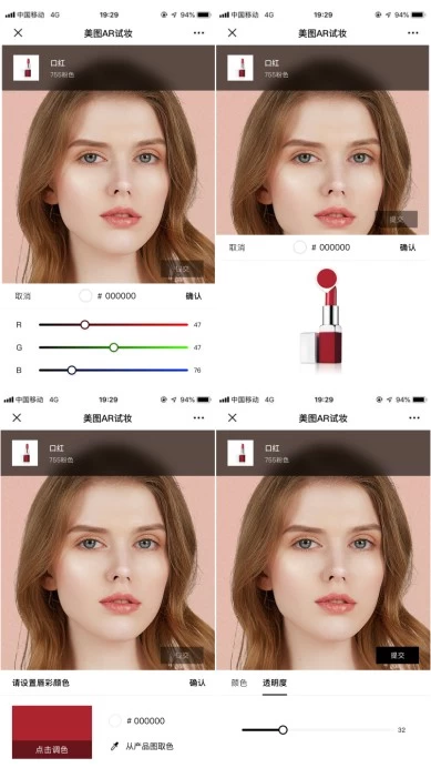该在线试妆系统依托于美图魔镜AR试妆影像技术,围绕着美业零售的销售场景,可以提供唇彩、眼影、腮红、粉底等彩妆产品的试用及销售。美妆企业可利用美图魔镜在线试妆系统,通过妆效配置、导图取色等功能制作本品牌的彩妆产品试色网页,引导消费者进行线上试妆,提升消费者线上购买体验。除企业外,各大零售门店的BA也可关注美图公司官方微博或登陆美图魔镜官方网站申请使用。