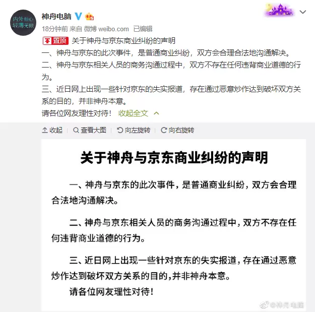 神舟声明:与京东是普通商业纠纷,有人恶意抹黑京东