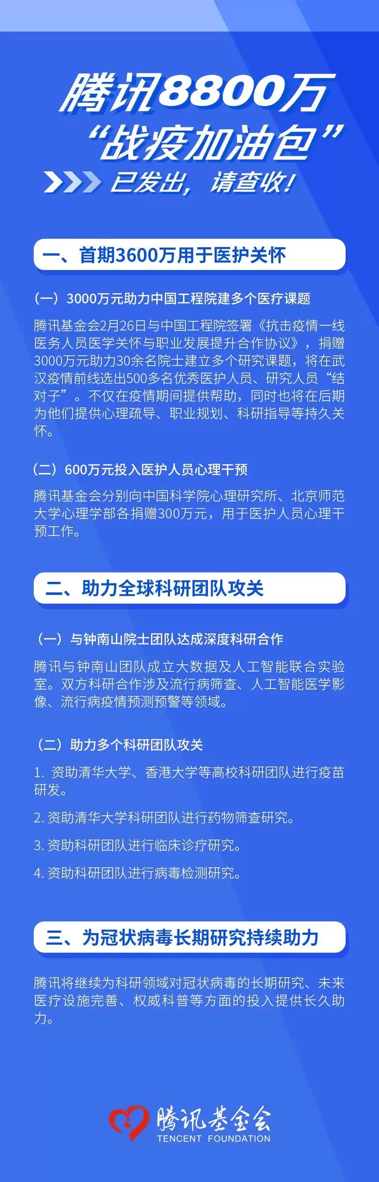 第一波“战疫加油包”发出后,腾讯将继续为科研领域对冠状病毒的长期研究、未来医疗设施完善、权威科普、公共卫生保障等方面的投入提供长久助力。