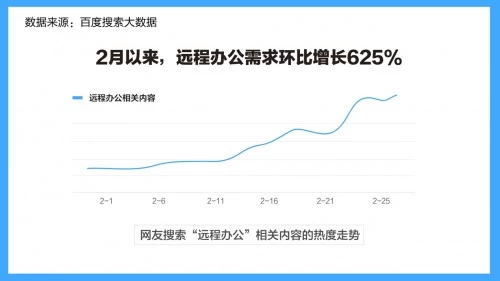 但这并不意味着大多数企业还没有复工,事实上,这是因为大多数企业都选择了“云复工”模式。百度大数据显示,云复工成为多数企业的首选复工方式,远程办公需求在过去两周呈现爆发式激增。以百度网盘企业用户的活跃度来看,其日活用户至2月以来上涨超过50%,而整体搜索远程办公需求的热度也在过去三周增涨了625%。
