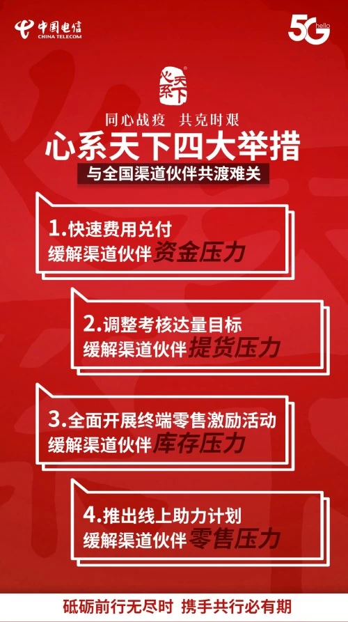 “心系天下”作为中国电信专属定制的手机品牌,在这次的疫情中也积极参与到这次的防控抗“疫”当中。渠道商是“心系天下”手机最紧密的合作伙伴,12年来心系天下深耕渠道、赋能渠道、助力打造标杆零售门店,实现与渠道伙伴的合作共赢。结合当前的疫情发展,“心系天下”积极响应,实施四大举措助力渠道伙伴复工复产。一是快速费用兑付,缓解渠道伙伴的资金压力。心系天下将加快启动2019年未兑付的激励费用,缓解渠道伙伴因疫情所带来的短期资金压力。二是调整考核达量目标,缓解渠道伙伴提货压力。针对疫情期以及疫情逐步恢复期,心系天下将相应调整考核目标,及销售达量阶梯,考核导向从提货向零售转变和疏导,消除渠道伙伴提货方面的后顾之忧。三是全面开展终端零售激励活动,缓解渠道伙伴库存压力。在全渠道开展心系天下产品终端激励活动,提升末端的销售积极性,促进渠道库存消化,助力渠道商资金快速回流。四是推出线上助力计划,缓解渠道伙伴零售压力。疫情期间,心系天下官方商城将服务各省客商,统一搭建线上销售平台,助力线下门店发货,促进用户销售转化。