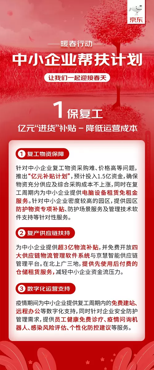复工物资保障和复产供应链畅通是中小企业顺利复工复产优先级最高的需求。于是,京东中小企业帮扶计划推出亿元“进货”补贴,在保障物资供应、稳定价格的同时,有效帮助企业降低运营成本。同时,京东在中小企业密度较高的园区落地精准帮扶,通过专项防护物资补贴、安全防护资源支持及技术扶持,助力中小企业快速复工。