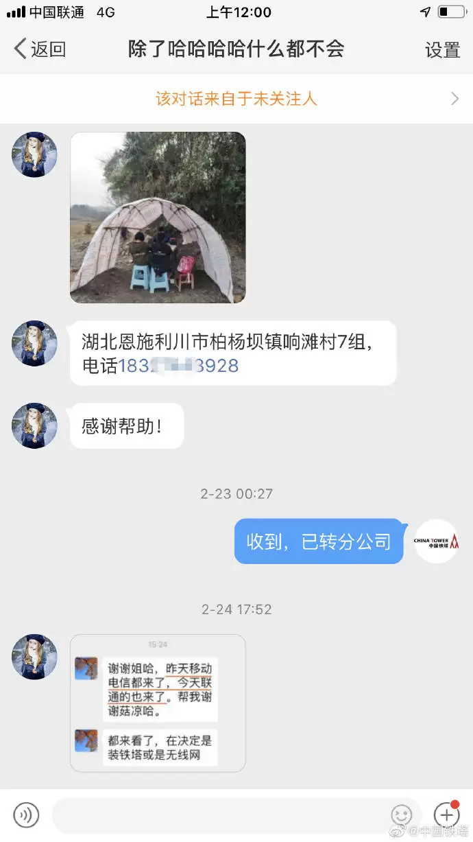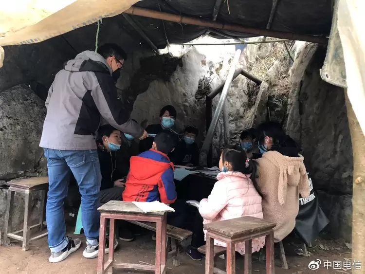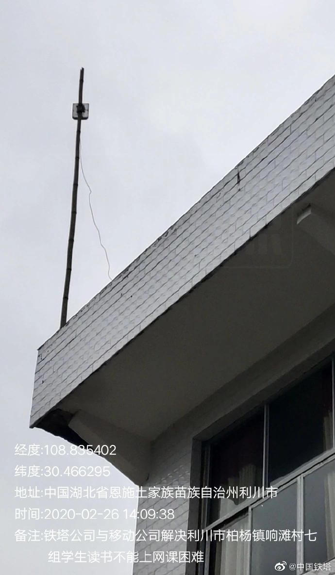 2月23日,中国铁塔通过微博获悉湖北恩施利川市柏杨镇响滩村七组6名学生因信号弱问题无法在家上网课,家长们在附近的野外寻找到一处三家运营商信号满格的地方临时搭建了一个棚子,供孩子们集中上课。