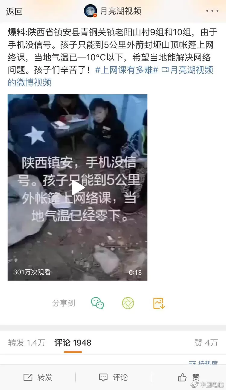 此外,2月15日,陕西商洛市镇安县青铜关镇阳山村“因网络信号弱学生到山上搭帐篷上网课”的视频在网上发布,引发社会广泛关注。