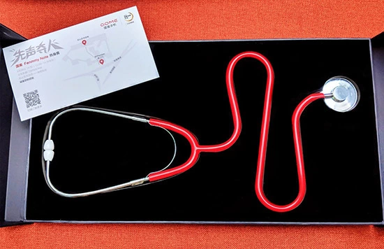 “国美Fenmmy Note热身赛”的实体邀请函非常别致,黑色简洁的外包装打开后是一支红色导管的听诊器,且本次“国美Fenmmy Note热身赛”的Slogan为“先声夺人”,不难看出国美Fenmmy Note或将在相关方面上做文章。