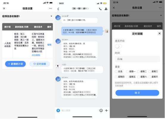 例如,学校需要每日统计学生的健康信息;社区人员需要统计人员的流动信息;随着返工潮的到来,每家企业都要统计返程员工的信息,而且根据疫情要求,每位外来员工都需要先隔离十四天,这十四天还需要实时统计员工的健康信息;隔离区的人员更是需要24小时密切监控采集信息;降低风险的同时,也带来了大量信息的收集处理更新工作,需要投入大量的工作人员,使得防控人力始终处于紧张状态。
