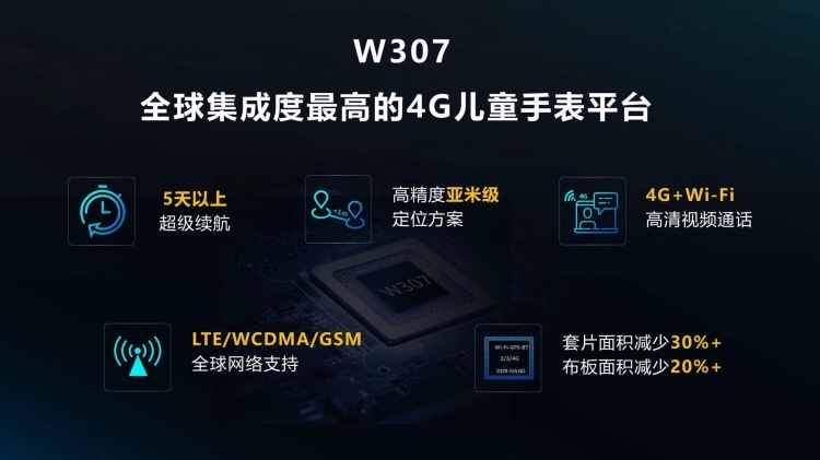 此外W307支持4G+WiFi的高清视频通话,以及LTE/WCDMA/GSM全球网络制式,不管距离多远,都可以“见表如面”,如在眼前。高度集成的架构设计,与上一代平台相比,套片面积减少了30%以上,布板面积减少了20%。