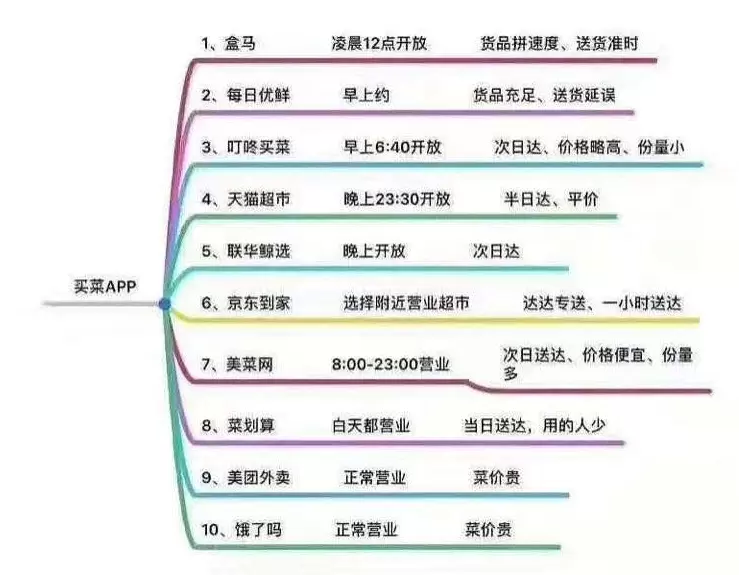 不多时,各大微信群开始流传一张《抢菜指南》标注好了各家生鲜电商的APP库存更新时间以及各平台的优劣势,抢菜闹钟从早上的5点提前到了前一天的23:30。天猫超市晚上23:30开放第二天库存,盒马凌晨12点开放新一天的库存,每日优鲜早上预约,叮咚买菜早上6:40开放……