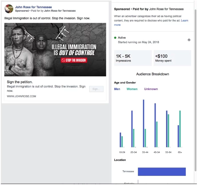此外,Facebook推出了一个可搜索的公共档案,用于存储所有投放在Facebook和Instagram上的网络政治广告。人们可以就具体政治话题搜索这一数据库,查看特定政治广告产生的展现量、广告成本、观看该广告的年龄和性别等细节。例如,当搜索“移民”关键词时,人们会看到一系列与该话题相关的政治广告。