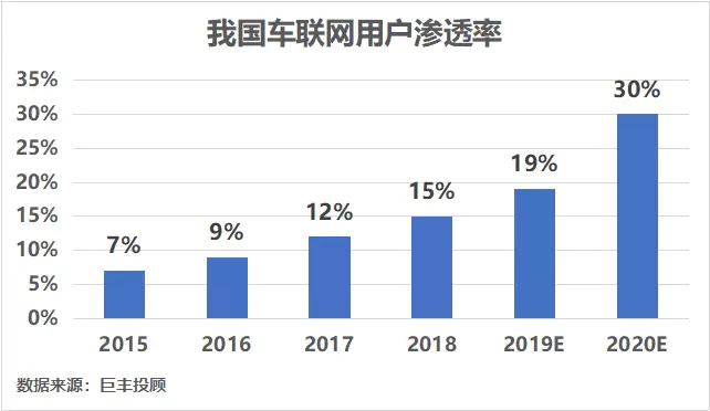 近几年,由于受益于宏观政策驱动以及5G技术的落地,我国车联网市场规模保持着高速增长。当前我国汽车市场巨大,2019年数据显示我国轿车保有量已达3.4亿辆,这一巨大的汽车市场为我国车联网服务的发展直接提供了成长土壤,车联网用户渗透率自2015年(渗透率仅7%)后不断提高,预计今年我国车联网用户渗透率或将达30%左右。