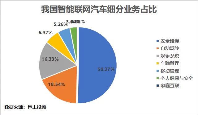 而车联网在我国主要业务分为安全碰撞、自动驾驶、个人健康与安全以及娱乐系统等。在这其中,安全碰撞业务占比最高约为50%左右,其次是自动驾驶,占整个车联网业务的18.50%。以上两块是我国车联网业务的主要领域。