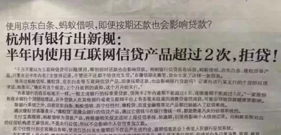 银行新规,用蚂蚁借呗和京东白条的有麻烦了!为什么你按时还款,贷款却不能审批?近期,有银行出新规,半年内使用互联网信贷产品超过2次,拒贷!