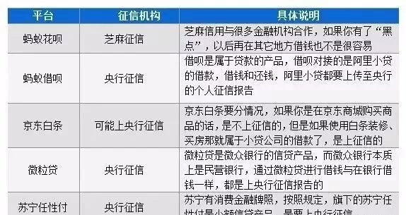 4、信用大网,正式形成!除银行系统之外,目前京东白条、蚂蚁借呗、苏宁任性付、微粒贷、百度金融等常见产品都已经接入了征信系统。