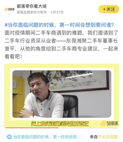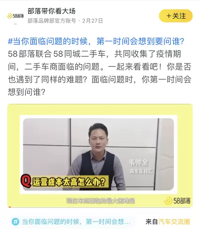 面对疫情期间二手车商遇到的经营难题,58部落联合58同城二手车发起了#当你面临问题的时候,第一时间会想到要问谁?#话题,为二手车行业的的车商和关注者提供交流平台,共同探讨疫期行业发展趋势。