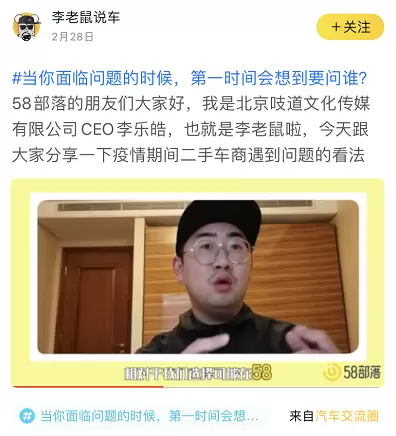 另一方面,为了帮助二手车商在疫期渡过经营低谷,更好地生存发展,58部落与58同城二手车邀请二手车行业大咖为车商答疑解惑,带来富有建设性的建议。二手车自媒体大咖“李老鼠说车”表示,针对二手车企业员工在家办公效率低的问题,应当每天早上制定好当天工作计划,用企业协同软件同步各人工作效率和最终成果。二手车商可以通过直播等在线宣传吸引用户关注,比如上58同城发布二手车信息,他还认为,可以在疫情期间进行线上引流,在用户心智中让品牌扎根,等市场恢复后,取得热销效果。