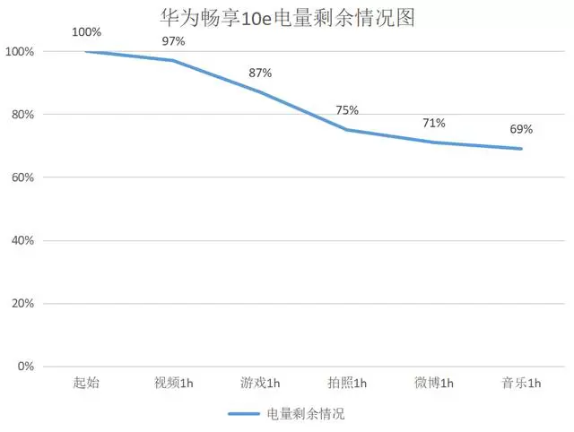 当然,作为实力派的品质千元机,拍照好是远远不够的,针对年轻人的重度用机需求,这款手机内置了5000mAh的超大容量电池,也许一些小伙伴对5000mAh电池概念不清晰,因此笔者特进行了五小时高频使用测试,借此数据化的呈现华为畅享10e的续航实力。从图中可以看出,在连续进行1h视频、1h游戏、1h拍照、1h微博、1h音乐后,华为畅享10e剩余电量仍有69%。相比起来,一般手机的游戏、拍照耗电量都在20%左右,足见其续航能力出众。更加让人惊喜的是,它还支持反向充电,仅需一根OTG充电线,华为畅享10e就可化身为充电宝,为其他设备提供稳定的电力输出,这个功能堪称非常实用呀。
