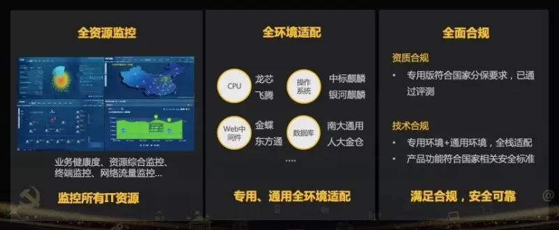 截至目前,锐捷RIILXC版是业内唯一一款可以提供专用平台+通用平台环境全适配、全功能的信息创新运维平台,从资源监控、关键业务、决策分析到服务质效管理的一站式全景可视化解决方案,帮助用户实现平滑过渡。在通用信息设备环境下,实现了对龙芯、申威、飞腾、鲲鹏、海光等芯片,中标麒麟、银河麒麟、深度、中科方德等操作系统,人大金仓、南大通用、武汉达梦为代表数据库,金蝶、东方通、中创为代表中间件等信息技术应用创新环境的全栈适配。在专用信息设备环境运维场景中,锐捷遵循国家最新技术标准专业打造专用计算平台版运维监控系统,实现了专用服务器、专用桌面机、专用交换机、专用安全设备、安全数据库和中间件的集中监管。