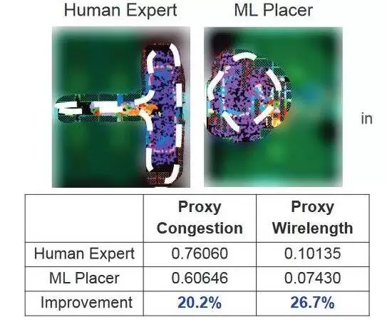 比较针对布局与绕线ASIC设计的专家经验与低功耗ML加速芯片的结果。但Google故意遮掉了部分影像…(来源:Google Research/ISSCC)