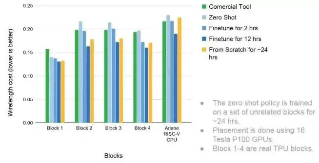 Google采用几个不同模块的测试电路,比较使用ML教自己布局和绕线ASIC设计的AI性能。此外,并在渐进式间隔的额外调整后,比较相同ML与商用工具的性能。(来源:Google Research/ISSCC)
