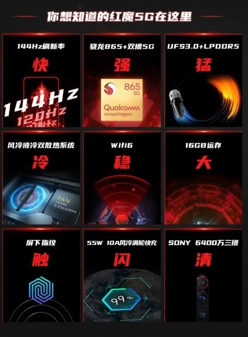 据之前报道汇总,红魔5G游戏手机将搭载高通骁龙865处理器,全球首发144Hz刷新率屏幕,采用UFS3.0+LPDDR5的组合,拥有12/16GB运存版本,全系标配WiFi6,内置一颗15000转/分的高效能离心风扇。采用索尼IMX686CMOS,拥有1/1.7英寸的尺寸,单个像素尺寸达0.8μm。新机搭载高效能离心风扇,转速达到了15000转/分。此外,该机将采用55W 10A风冷涡轮快充技术。