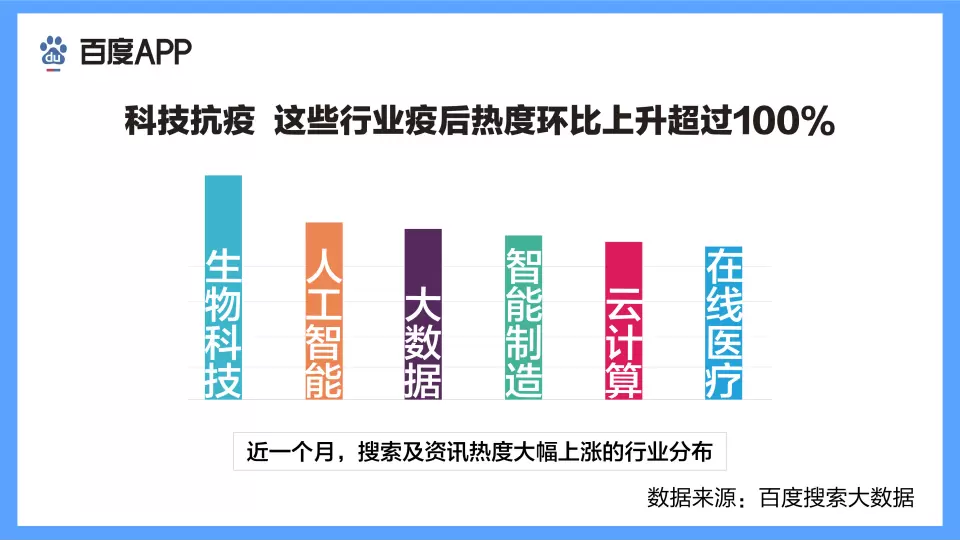 科技抗疫是疫情发生以来大家最为关注的热点之一,因此相关新兴产业的关注度也在近期飙升明显。人工智能、大数据、云计算等行业热度环比上涨超过100%。这些技术在疫苗、药物研发、病毒研究、防控等领域的应用尤其受到关注。