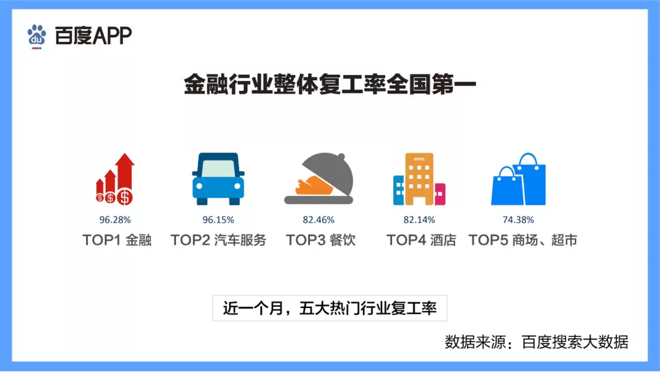 从传统行业来看,由于行业工作性质不同,各行各业的复工比例也各有不同。百度统计了金融、汽车服务、餐饮等五个热门服务行业的复工数据显示,大部分行业复工率都超过了七成以上,大家的复工生活已经完全可以得到满足。