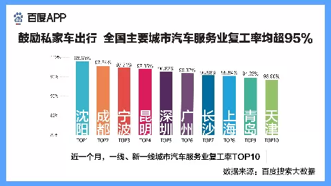 疫情带来的风险尚未完全消失,为了减少接触,复产复工时,私家车出行增多。百度搜索大数据显示,全国主要城市汽车服务业复工率均超过95%,沈阳市再次位居榜首。
