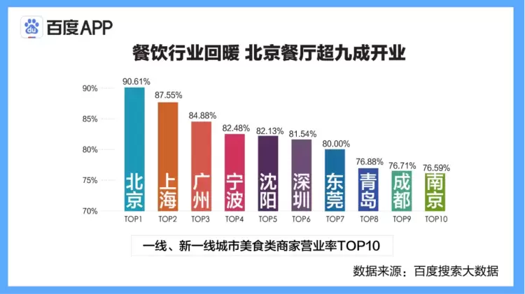 人们对复工复产的感知更多来自日常生活,众多超市、饭店近来陆续开门营业。百度搜索大数据显示,餐饮行业复工进展顺利,北京已有超九成餐厅开业,上海、广州、宁波、深圳等城市营业率均超过80%。