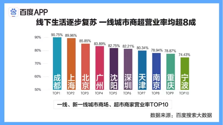 线下消费需求逐渐回暖,一线城市、新一线城市商场、超市正逐步恢复正常运行。目前,成都、上海、北京、广州、沈阳等城市商超营业率均超过80%,商家开门营业,在推动经济发展的同时,也满足了人们日常的消费需求。