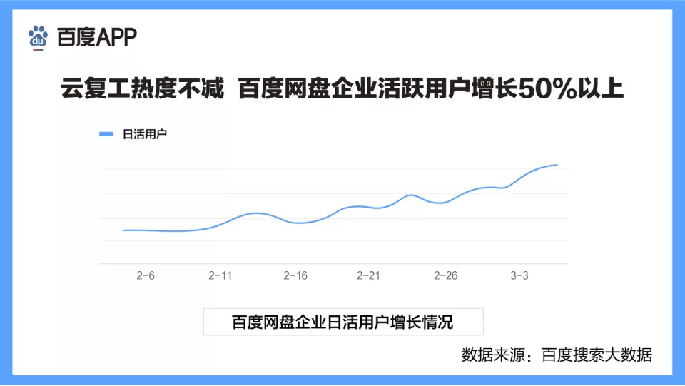 各行业线下全面复工的同时,云办公的热度也丝毫不减。百度搜索大数据显示,近7天,百度网盘企业活跃用户数增长在50%以上。许多企业将云办公与线下复工两种方式结合,减少聚集,最大限度保障员工安全。