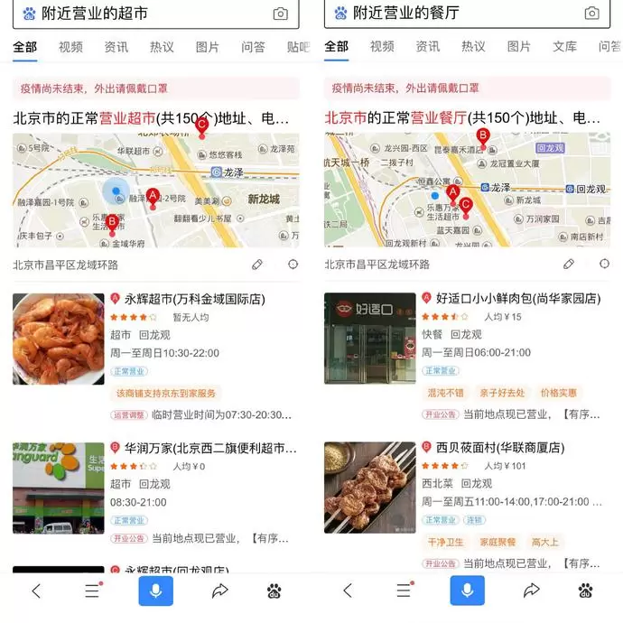 为了满足给用户提供切实可靠的商家信息,百度App对商户信息及时更新,用户搜索“附近营业的超市”、“附近营业的餐厅”即可了解附近超市、商场、餐饮等场所的营业状态、最新营业时间。