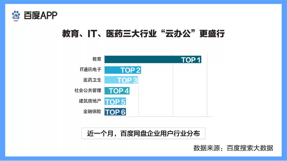 由于办公的特点不同,云办公也“挑行业”。 近一个月,教育、IT、医药三大行业的百度网盘企业用户数量最多。而云办公也为疫情期间“在线教育”、“在线医疗”等业务的发展提供了基础条件。