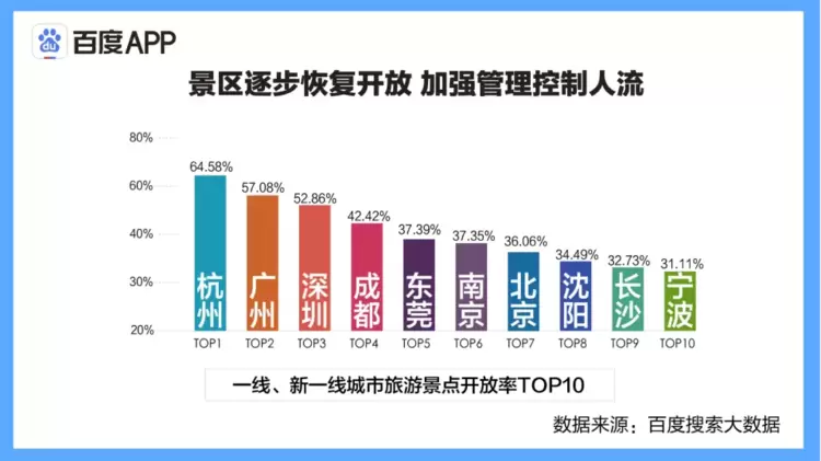 此外,疫情期间受到重大影响的旅游行业也开始逐步回温。从百度搜索大数据全国旅游景点开放率TOP10来看,杭州、广州、深圳等一线、新一线城市,由于原本旅游业较发达,且受疫情影响相对较小,景区开放率更高。