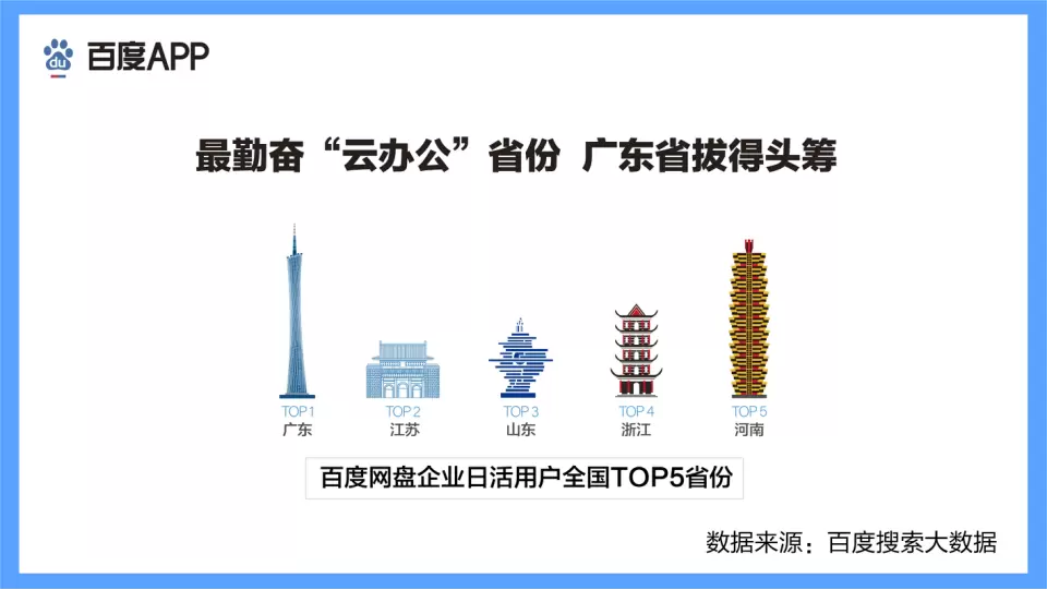 在云办公这件事上,南方省份更积极,百度搜索大数据显示,广东省是云办公最勤奋的省份。江苏、山东、浙江、河南等省份紧随其后,南方省份占TOP5中的三席。