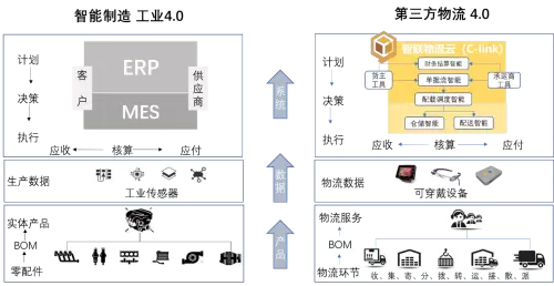 而对于第三方物流企业,其产品即“物流服务”,该产品由“收、集、寄、分、拨、转、运、接、散、派”等一系列“零件”组成的,对其采购、调度、组装、交付等一系列环节,完全可借鉴“智能制造”理论的成功实践和管理经验。逗号科技推出的“智联物流云(C-Link)” 三方物流智慧数字化运营平台,可视为三方物流行业的“ERP(企业资源管理系统)+MES(制造执行系统)”。