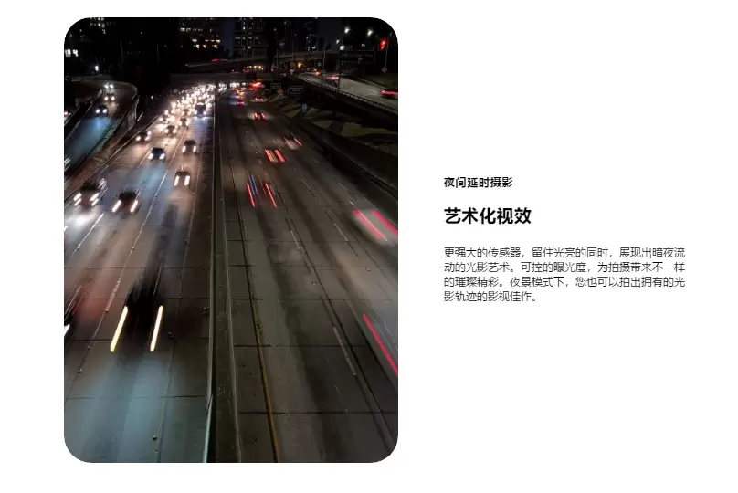 与此同时,Galaxy S20系列还为追求创意的达人们提供了更加丰富精彩的摄影玩法。例如夜间延时摄影效果,能够拍摄出暗夜流动中美轮美奂的光影轨迹,有了这样的技能,相信你一定能成为朋友圈中的“网红艺术家”。