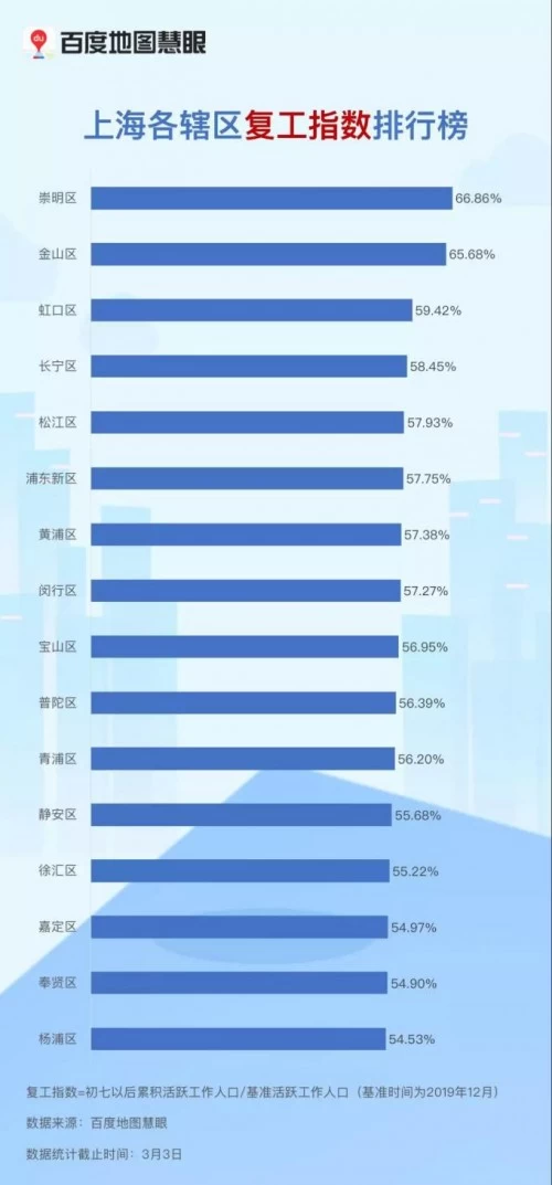 除了首都北京外,百度地图还对上海各区县复工复产情况进行了大数据跟进。截至2020年3月3日数据统计,上海市复工指数TOP5辖区为:崇明区(66.86%) 、金山区(65.68%)、虹口区(59.42%)、长宁区(58.45%)、松江区(57.93%) 。其中,崇明区复工指数为全市第一;杨浦区、奉贤区、嘉定区、徐汇区、静安区、青浦区、普陀区、宝山区复工指数均低于全市平均水平(57.23%)。