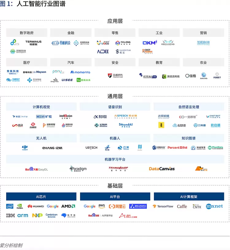 报告认为,从底层基础技术到上层行业应用,可以把人工智能行业划分为基础层、通用层和应用层三部分。基础层为图像、语音等人工智能基础技术提供芯片、计算框架等计算能力支持,通用层提供感知、认知计算等通用技术,而应用层则是人工智能通用技术与各行业深度融合产生应用价值的产品和服务。
