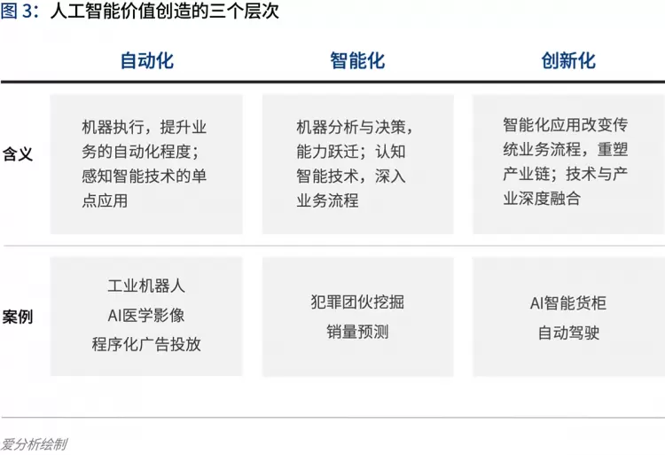 报告指出,发展至今,人工智能经历了明显的泡沫降温,进入了技术成熟度曲线的低谷期。行业开始回归理性,更多地关注人工智能如何落地产业,推动企业的数字化转型。人工智能落地产业带来的价值创造,可以分为自动化、智能化、创新化三个层次,每个层次创造的价值度逐步提升。