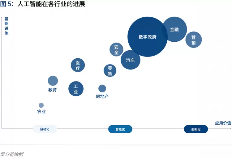 报告分析,随着产业数字化带来的数据基础的日益成熟,人工智能在营销、金融、数字政府、零售、医疗等行业的落地持续推进,并开始带来显著的效益,但落地进展有先后之分。在部分行业,传统企业已经充分认可人工智能的应用价值,开始在实际业务场景规模化地引入相关技术。首先,在人工智能实际落地过程中,产业的数字化基础设施是影响落地进展的关键要素。产业数字化程度越高,人工智能的应用具备越完善的数据基础。其次,在数据基础设施差异的基础上,人工智能技术与各行业具体业务场景结合产生的主流应用场景和价值呈现也有不同,会处于不同的应用价值阶段。最后,基于不同行业的市场规模体量,人工智能技术应用创造的市场规模大小不同。下图中,气泡的大小代表了现阶段各个行业人工智能应用的市场规模,包括软件、硬件和服务。