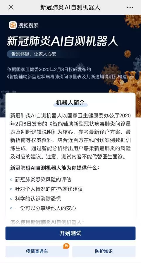 通过“新冠肺炎智能问答”、“新冠肺炎AI自测”等一系列AI工具,在此次疫情防控工作中,搜狗深度参与并广泛应用于全国基层医疗卫生机构数字化防疫工作。