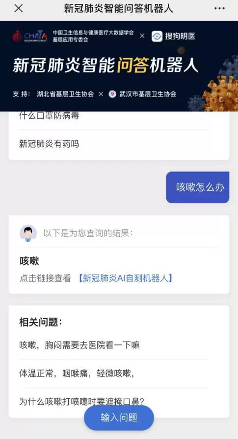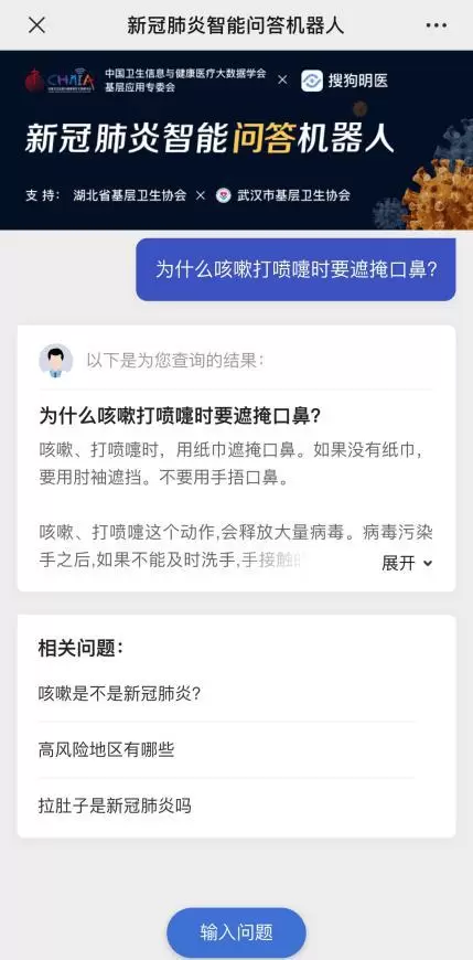 社区作为疫情联防联控第一线,对打赢疫情防控狙击战至关重要。为进一步减轻基层医疗机构和一线医护人员工作压力,及时、高效、精准为公众解答疫情相关健康疑问,搜狗明医近日联手中国卫生信息与健康医疗大数据学会基层应用专委会,面向全国各省市(区、县)卫健委、基层医疗机构推出“新冠肺炎智能问答”AI工具。