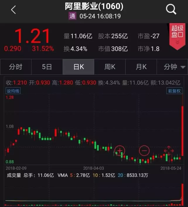 此外,就在5月23日,摩根士丹利发布研报称,阿里影业通过品牌曝光,拉动线上售票业务增长,但过高的营销支出将消耗部分盈利,因此给予“持股观望”评级,给出目标价0.95港元。